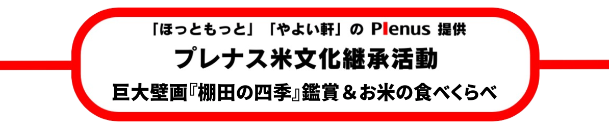 【午前の部】 10:00〜10:30:受付 10:30〜10:55:プレナス事業紹介・『棚田の四季』ミニドキュメンタリー視聴 10:55〜11:20:「棚田」について知ろう 11:20〜11:40:『棚田の四季』ギャラリー鑑賞 11:40~12:00:お米の食べくらべ 【午後の部】 14:00〜14:30:受付 14:30〜14:55:プレナス事業紹介・『棚田の四季』ミニドキュメンタリー視聴 14:55〜15:20:「棚田」について知ろう 15:20〜15:40:『棚田の四季』ギャラリー鑑賞 15:40~16:00:お米の食べくらべ |