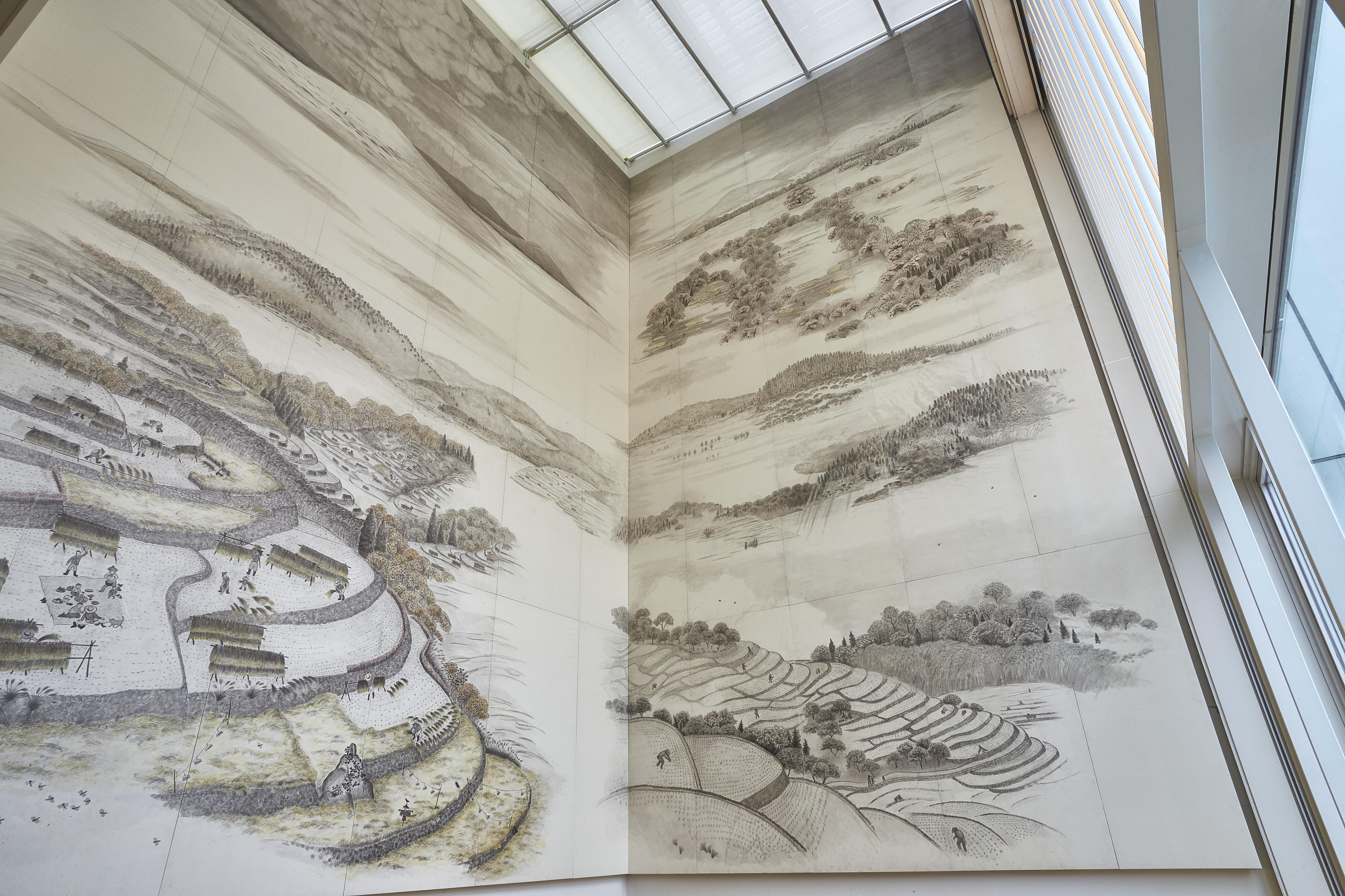 壁画『棚田の四季』は、日本の原風景である棚田の春夏秋冬を描いた、高さ約 8m の巨大な壁画です。